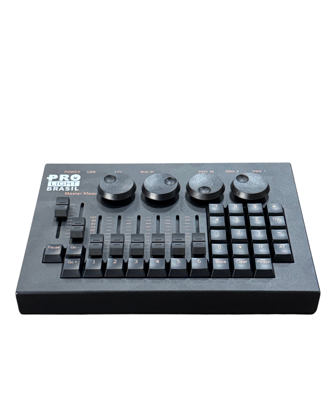 6 faders executivos (comprimento 60mm), 18 botões fader executivo, 2 faders interruptor A/B (comprimento 100mm), 6 botões executivos, 6 botões página (canal/fader/botão), 4 codificador.